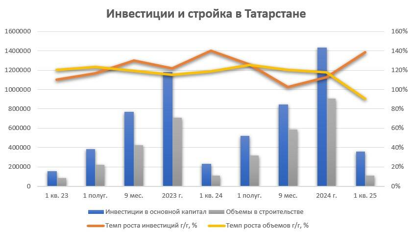 Действительно, по итогам прошлого года объем инвестиций в Татарстан вырос на 12,7%, в реальном объеме преодолев историческую планку в 1,43 трлн рублей. А по итогам первого квартала 2025-го вложения в республику скакнули уже на 38,4% (к аналогичному периоду 2024-го), до 357,6 млрд рублей. При этом без учета субъектов МСП и «объема инвестиций, не наблюдаемых прямыми статистическими методами» рост оказался еще выше – 44,7%, в реальном выражении это более 276,3 млрд рублей.