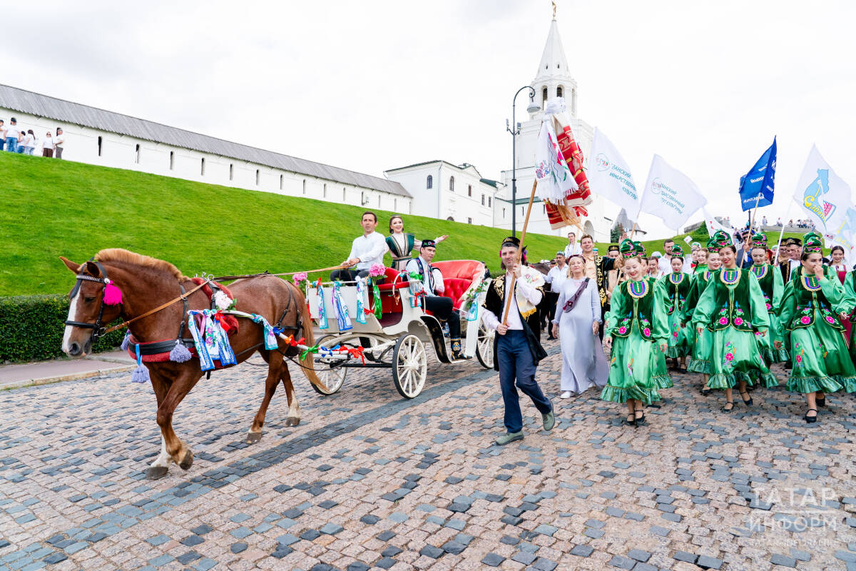 Церемония сбора подарков началась ближе к 11 утра. Всего по городу прошли четыре повозки: первая – от резиденции Раиса РТ в Казанском Кремле по Кремлевской и Баумана, вторая – от Государственного театра оперы и балета имени Джалиля по улице Пушкина, третья – от «Туган Авылым» по улице Минуллина, четвертая – по Старо-Татарской слободе по улицам Каюма Насыри и Марджани.