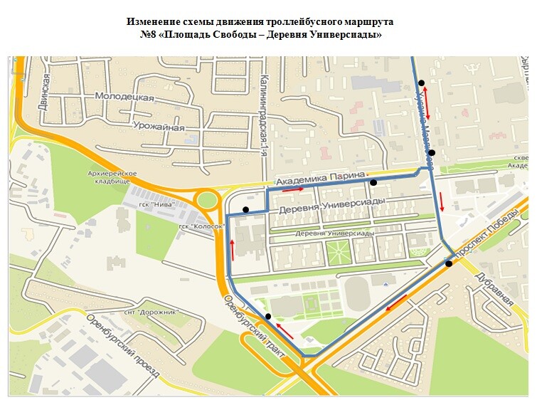 Сейчас троллейбус №8, напомним, не проезжает мимо Центра бадминтона и Академии тенниса. Следуя по улице Мавлютова, он поворачивает на улицу Академика Парина и двигается вдоль Деревни Универсиады, разворачиваясь на конечной развязке у пересечения с Оренбургским трактом (см. схему).