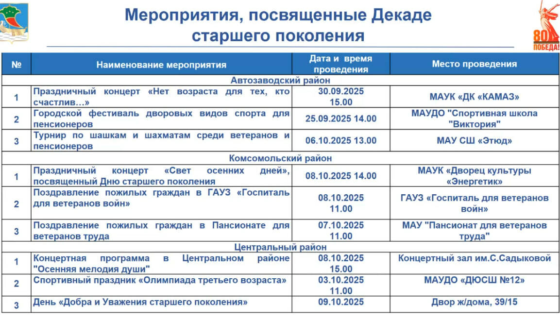 Первым событием стала праздничная программа «Нет возраста для тех, кто счастлив», прошедшая 30 сентября в ДК «КАМАЗ». 1 октября началась традиционная акция «Забота», в рамках которой представители администраций поздравляют пожилых жителей города и долгожителей. В эти же дни стартовало чествование юбиляров – ветеранов, отметивших 95- и 100-летие.