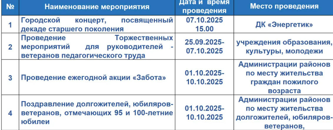 6 октября пройдет турнир по шашкам и шахматам среди ветеранов и пенсионеров, а 7 октября – городской концерт в ДК «Энергетик», посвященный декаде старшего поколения. В этот же день состоится поздравление пожилых граждан в пансионате для ветеранов труда.