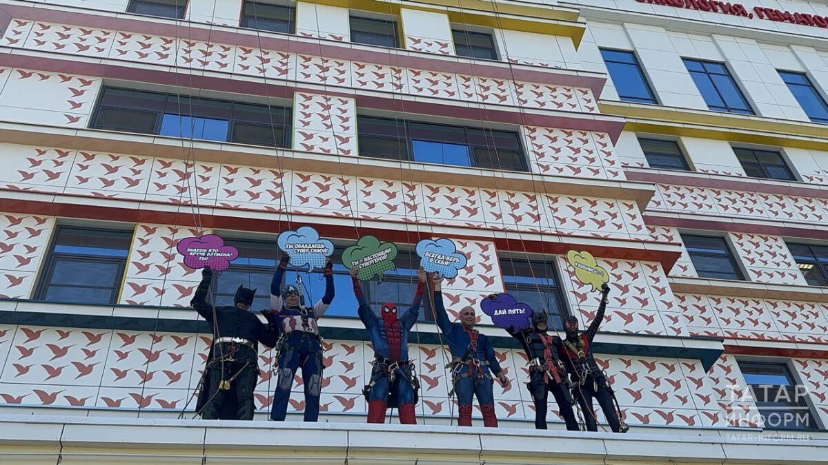 Добрейшая акция «Супергерои» прошла сегодня в Казанской Детской республиканской клинической больнице (ДРКБ). С крыши к детям больницы спустились настоящие супергерои – спасатели в костюмах Бэтмена, Человека-паука и Супермена.