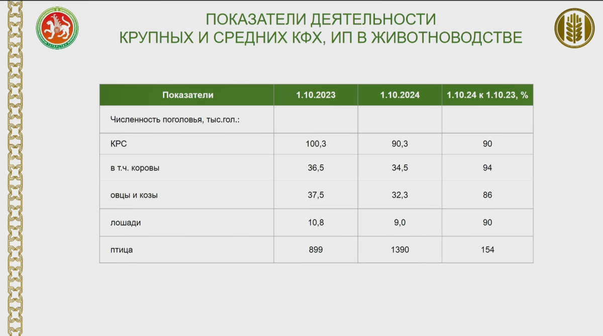 «По результатам работы малых форм у фермеров удельный вес в производстве сельхозпродукции за последний год несколько снизился, хотя все годы до этого имели ощутимый прирост. Это связано с падением позиций в животноводстве. Имеем ощутимое снижение по всем видам поголовья скота, рост только по поголовью птицы», — заметил в связи с этим в своем докладе Марат Зяббаров.