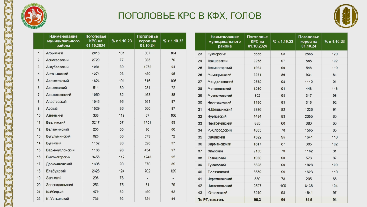 По словам министра, нарастить поголовье крупного рогатого скота удалось КФХ Агрызского, Алексеевского, Елабужского, Чистопольского, Высокогорского и Атнинского районов Татарстана. Наибольшие потери поголовья наблюдаются в Азнакаевском, Спасском, Рыбно-Слободском, Пестречинском, Бугульминском, Новошешминском и Черемшанском районах.