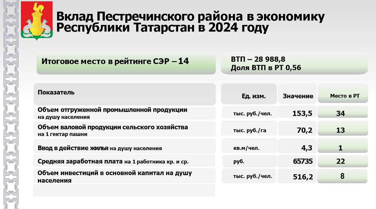Так, по итогам 2024 года Пестречинский район занял 14-е место в рейтинге социально-экономического развития, продемонстрировав рост внутреннего территориального продукта на 3%, до 26,2 млрд рублей. Объем инвестиций в 2024 году составил 34,3 млрд рублей, что на 7,3 млрд больше, чем в предыдущем году. Индекс промышленного производства достиг 107,3%.
