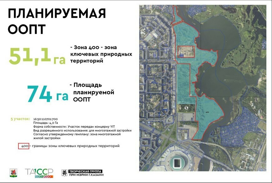 По информации мэрии Казани, территорию перевели сначала в зону рекреации по генплану, придали статус ООПТ. Строительный участок «ЮИТ» тоже сокращен, но он остается в собственности