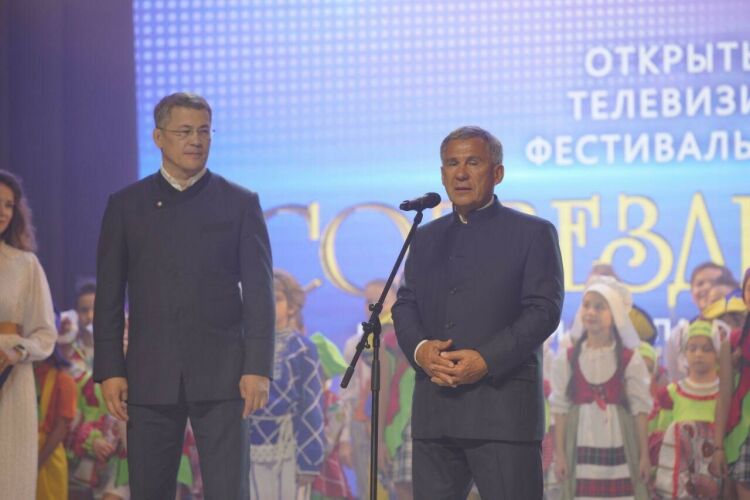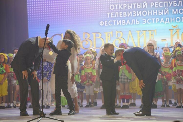 После выступления Минниханова и Хабирова дети вручили им медали фестиваля — «созвездия».