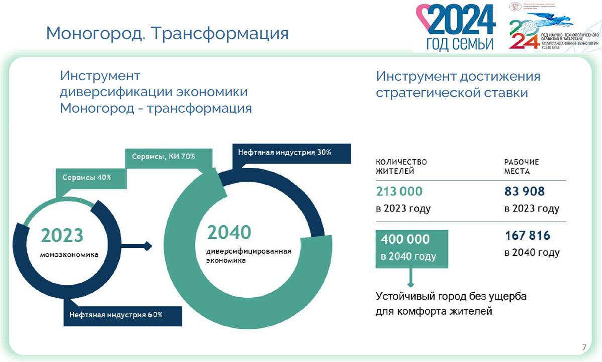 «У нас есть глобальная цель — к 2040 году мы хотим вырасти в количестве населения. Мы сейчас идем в этом направлении. К 2040 году без ущерба для нефтепромышленных предприятий мы должны добиться обратной пропорции, когда 70% занято в сервисных предприятиях», — заявил Нагуманов.