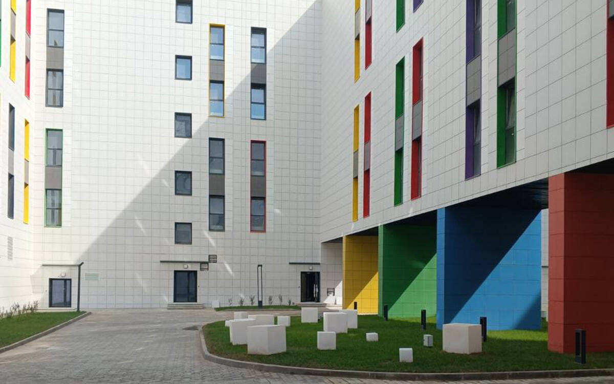 Фасад общежитий будет выполнен в белой цветовой гамме с добавлением бежевого и серого цветов в отдельных элементах здания. На первых этажах планируется разместить магазины, кафе, аптеки, а также коворкинги, пространства для студентов и преподавателей и общественные организации университета.
