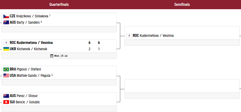 В полуфинале Кудерметова и Веснина сыграют с победителями пары: Крейчикова/Синякова (Чехия) – Бэрти/Сандерс (Австралия). Чешки – первая сеяная пара турнира, а австралийки, в составе которых играет первая ракетки мира Эшли Бэрти, также представляют собой мощный дуэт (6-е сеяные).