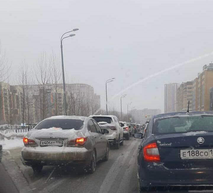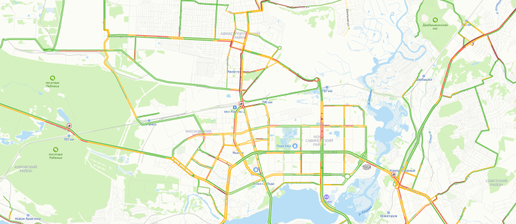 Движение в сторону центра города стоит на улицах Зорге, Ершова, Аделя Кутуя и на Оренбургском тракте. Красным цветом также отмечены проспект Победы, Воровского, Ломжинская, Минская, а также Мусина.