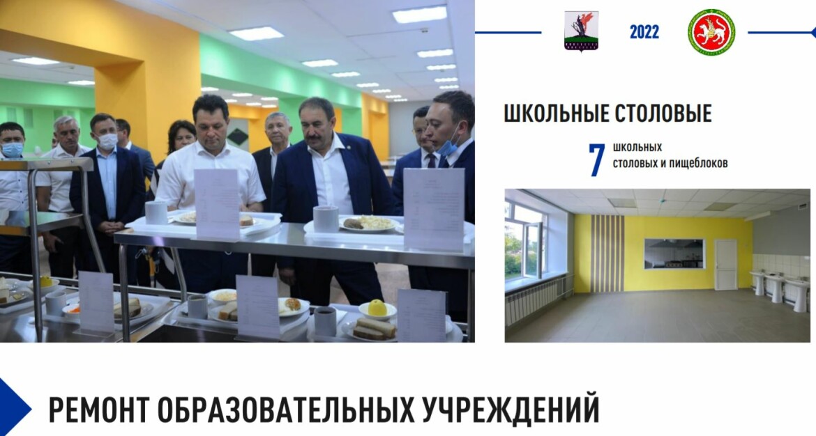 Благодаря республиканским программам в 2021 году произведен капитальный ремонт средней школы №9, функциональных зон «Точка роста» в сельских школах, отремонтированы семь школьных столовых и пищеблоков.