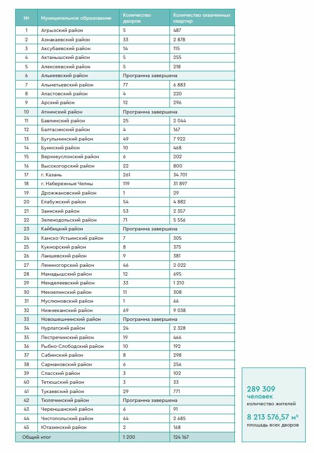 На сегодняшний день благоустроено уже 2 167 дворовых территорий Татарстана — обновленные, комфортные и уютные дворы появились уже у более чем 660 тыс. жителей республики. А в четырех районах благоустройство дворов по программе уже реализовано в полном объеме: это Атнинский, Алькеевский, Кайбицкий, Новошешминский и Тюлячинский районы.