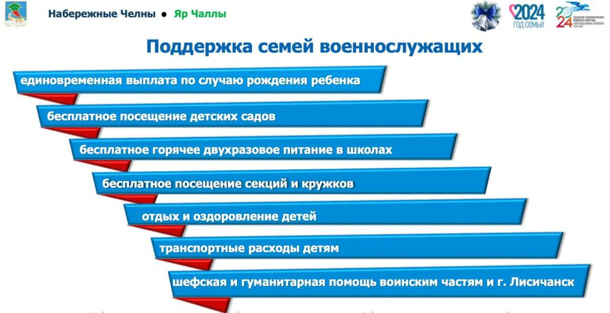 В 2024 году в семьях воинов родилось 57 детей — 25 мальчиков и 30 девочек. Руководство города лично встречает молодых мам в родильных домах, каждая мама получает единовременную выплату в сумме 100 тыс. рублей и необходимые вещи для малыша.