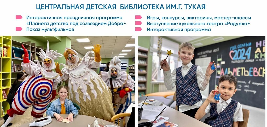 Интерактивная праздничная программа «Бэхетле Элмэт», организованная Детской библиотекой им. Тукая, откроется концертной программой, которую продолжит выступление «Петрушка и Шурале» кукольного театра «Радужка». В библиотеке можно написать письмо с пожеланиями счастья своим родным людям, поиграть в настольные игры, посмотреть любимые мультфильмы, познакомиться с новыми книгами и приобрести полиграфическую продукцию.