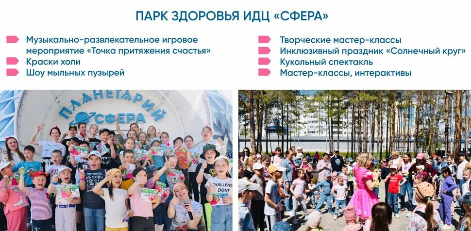 В парке Здоровье также ждут развлекательные мероприятия: краски холи, рисование цветными мелками на асфальте, мыльные пузыри и творческие мастер-классы, а также благотворительный концерт «Солнечный круг», который подготовили дети с ограниченными возможностями здоровья.