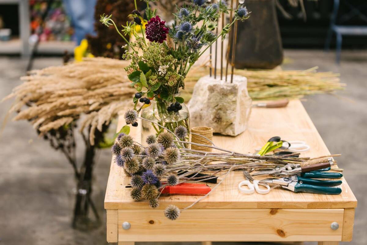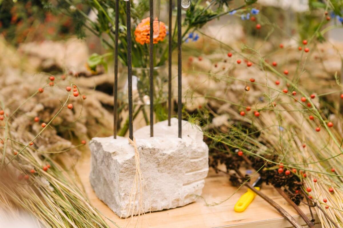 Для участников мастер-класса стало неожиданностью, когда перед ними в качестве материалов оказались арматура, чупаевский камень, дикоросы, полевые растения и живые цветы. Но в опытных руках Регины непривычные объекты показали себя с новой стороны и сложились в нежный осенний сюжет.