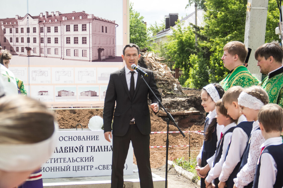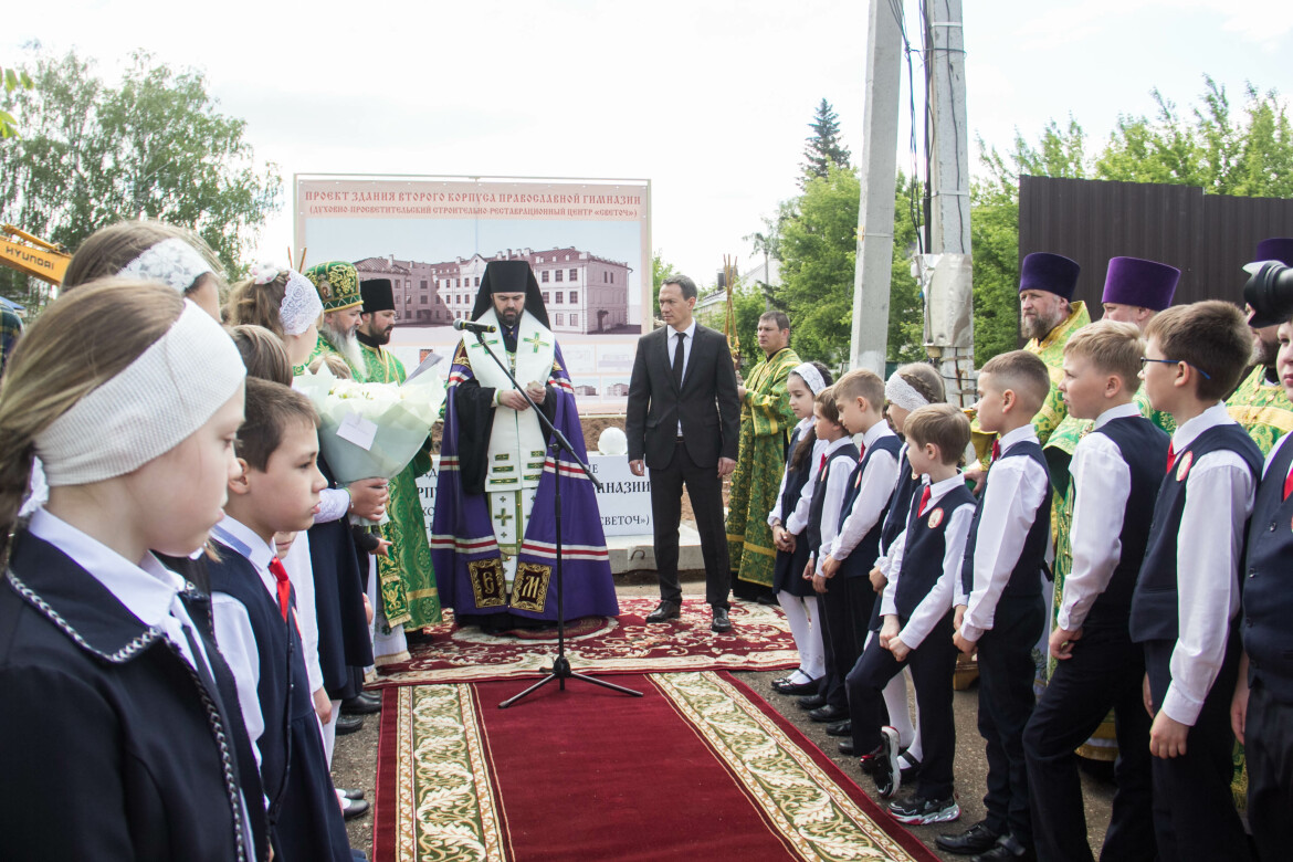 На месте будущего объекта была зачитана Грамота и произнесена молитва. После свиток вложили в капсулу и, окропив святой водой, заложили в основание второго корпуса гимназии.