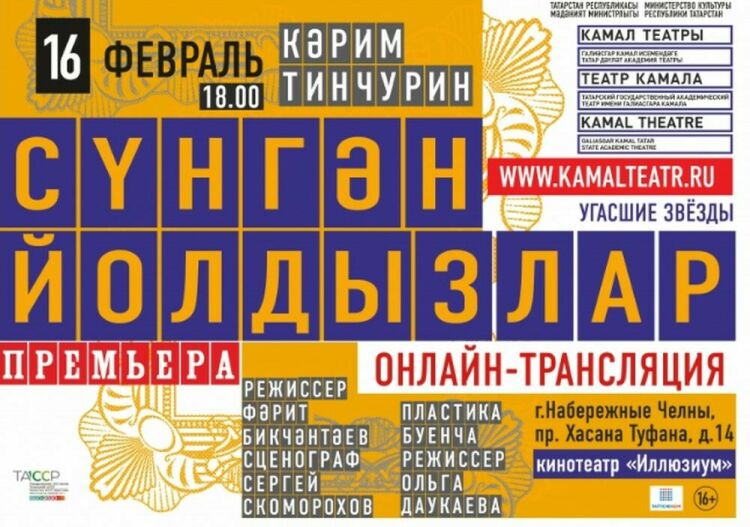 (Казань, 4 февраля, «Татар-информ»). В набережночелнинском кинотеатре «Иллюзиум» 16 февраля состоится онлайн-показ премьеры спектакля «Угасшие звезды». Трансляция будет вестись напрямую из театра Камала в HD-качестве. Это станет первым подобным примером в истории татарского театра, сообщает пресс-служба театра Камала.
