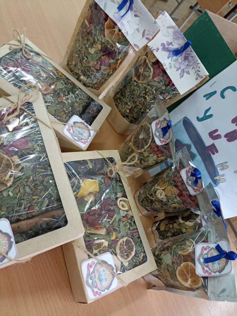 Травяные сборы ученики сделали сами на кружке «Музей чая». Ребята вместе с родителями заготовили ягоды, травы, высушили их и упаковали в красивые подарочные наборы, чтобы бойцам было приятно получить посылку.