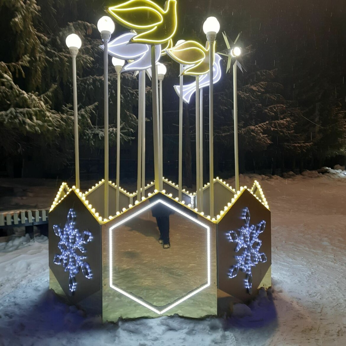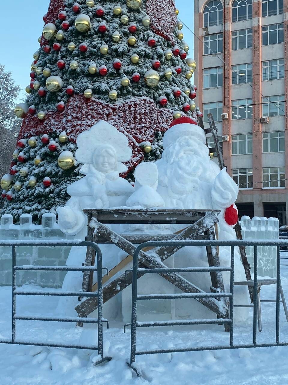 Часть инсталляций выполнена из льда и снега, а основные элементы — из дерева и металлоконструкций. Снежные фигуры на площади еще в работе, специалисты уже приступили к их покраске.