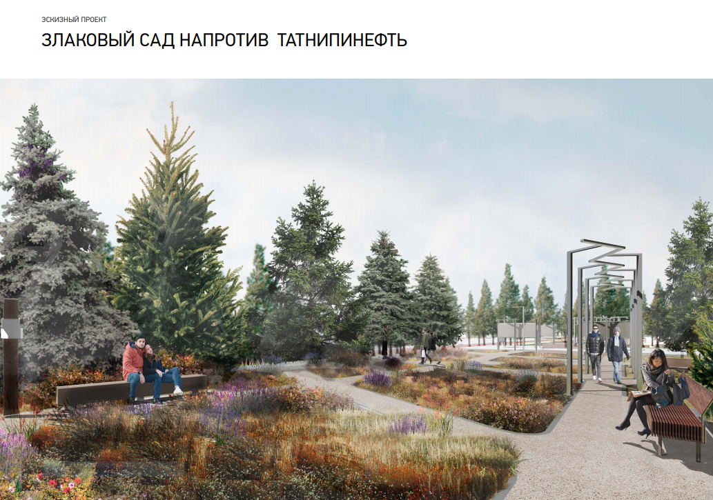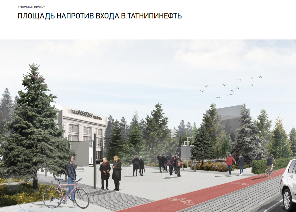 Территория перед зданием «ТатНИПИнефть» в данный момент носит исключительно декоративный характер. Проектом заложены решения по включению этих участков в общественно доступные зоны. Свободные участки у основного променада, перед зданием, а также на пути к главному входу дополняются информационными стендами об истории и деятельности института. Создание сети насыпных тропинок с местами рекреаций не затрагивает периметральную высадку голубых елей.
