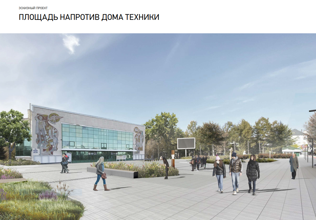 К примеру, территория перед Домом техники служит точкой сбора людей на городских праздниках. Проектом заложены решения, поддерживающие сложившуюся традицию. Так, на месте старых клумб сформированы зоны кратковременного отдыха для использования в непраздничное время. Покрытие площади также изменено в соответствии со стилистикой Дома техники и окружающей архитектурой. Для удобства использования площади добавлены небольшие клумбы по бокам от основного прохода. Там же размещены велопарковки.