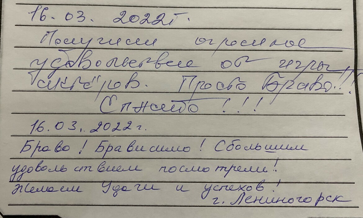 «Из книги отзывов от 16 марта: „Получили огромное удовольствие от игры актеров. Просто браво!!! Спасибо!!!“, „Браво! Брависсимо! С большим удовольствием посмотрели. Желаем удачи и успехов!“, „Спектакль Камышинского театра „Примадонны“ просто супер. Молодцы актеры! Удачи и творческих успехов коллективу театра“», — цитирует записи зрителей завлит театра.