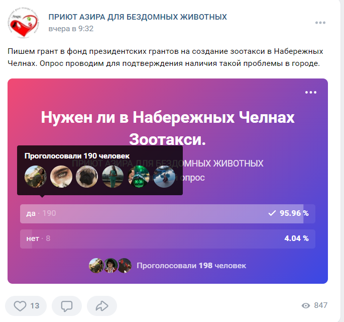 «Пишем грант в фонд президентских грантов на создание зоотакси в Набережных Челнах. Опрос проводим для подтверждения наличия такой проблемы в городе», — гласит сообщение.