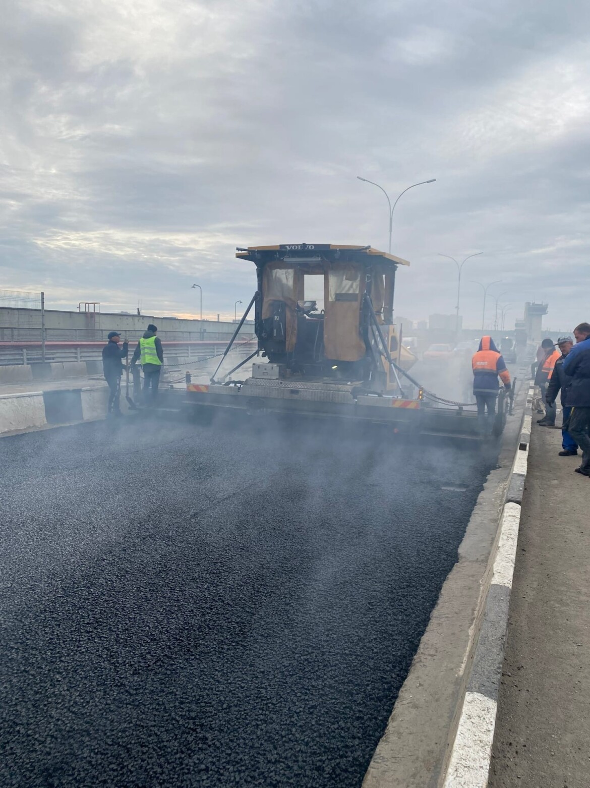 На мосту через Каму в Набережных Челнах приступили к укладке асфальта. По словам руководителя исполнительного комитета Автограда Фарида Салахова, дорожники работают всю ночь.