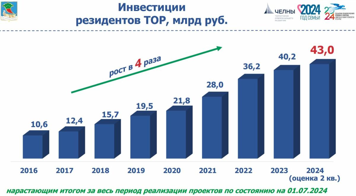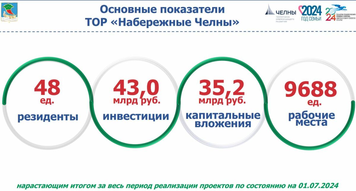 На сегодняшний день резидентами ТОР «Набережные Челны» стали 48 компаний. В экономику города вложено 43 млрд рублей инвестиций, осуществлено 35,2 млрд рублей капитальных вложений и создано 9 688 новых рабочих мест.