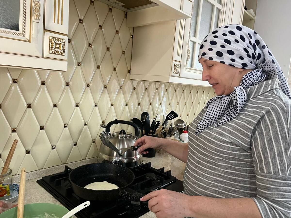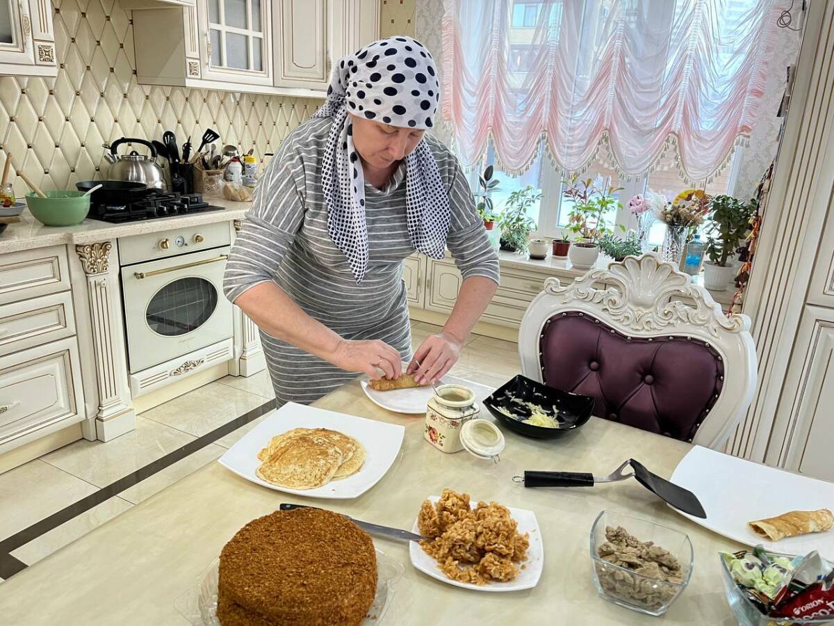 Мама военнослужащего специально приготовила угощение к визиту. «Очень вкусные получаются. Аккуратненькие делаю, вкусненькие. По-деревенски, по-домашнему», – рассказывает Равия, пока печет блины к приходу гостей.