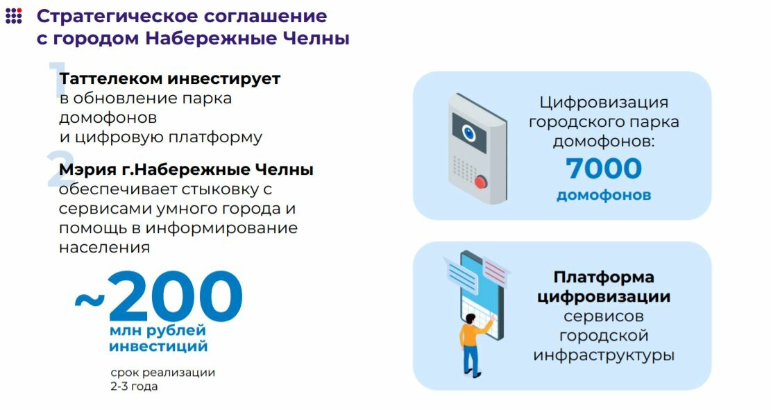 В рамках подписанного соглашения между исполкомом и Набережночелнинским ЗУЭС только в этом году в городе планируется установить около 3,5 тысяч IP-домофонов. Инвестиции проекта составляют более 200 млн рублей, всего будет установлено 7 тысяч панелей. Об этом на пресс-конференции в мэрии Челнов сообщил директор Набережночелнинского ЗУЭС Ильдар Нургалеев.