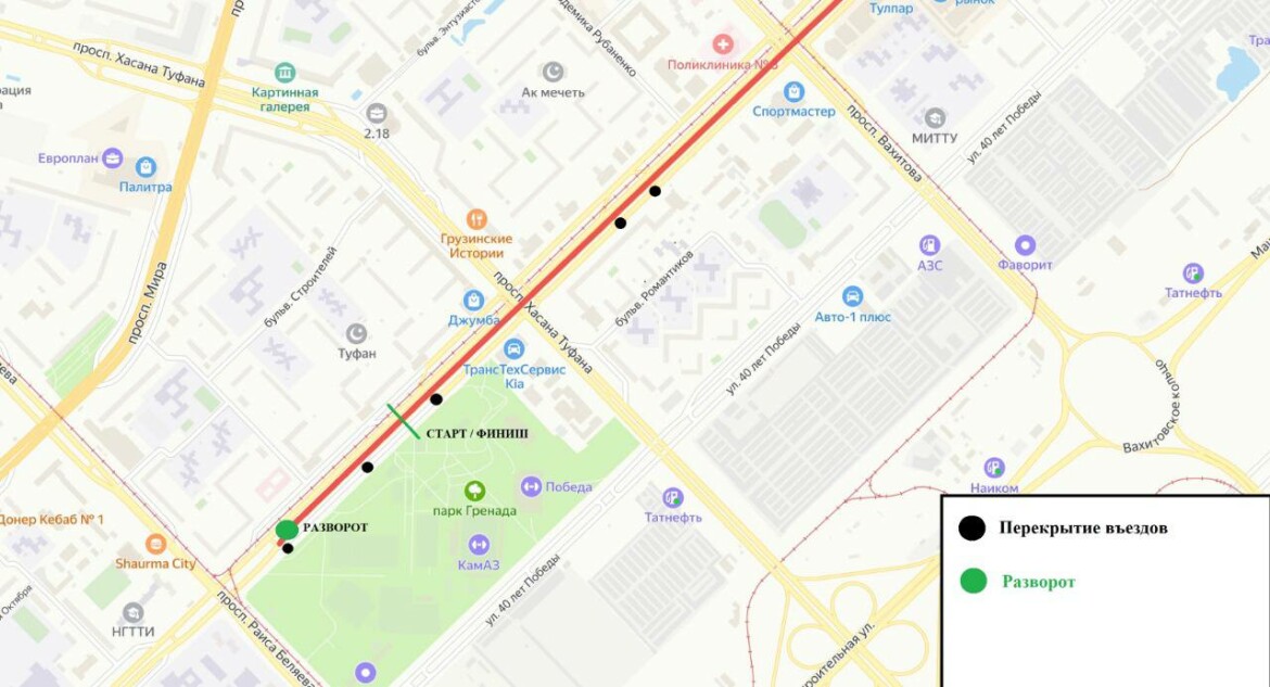 18 сентября с 9.30 до 14.30 — по проспекту Хасана Туфана на участке от проспекта Сююмбике до улицы 40 лет Победы в направлении к проспекту КАМАЗ.