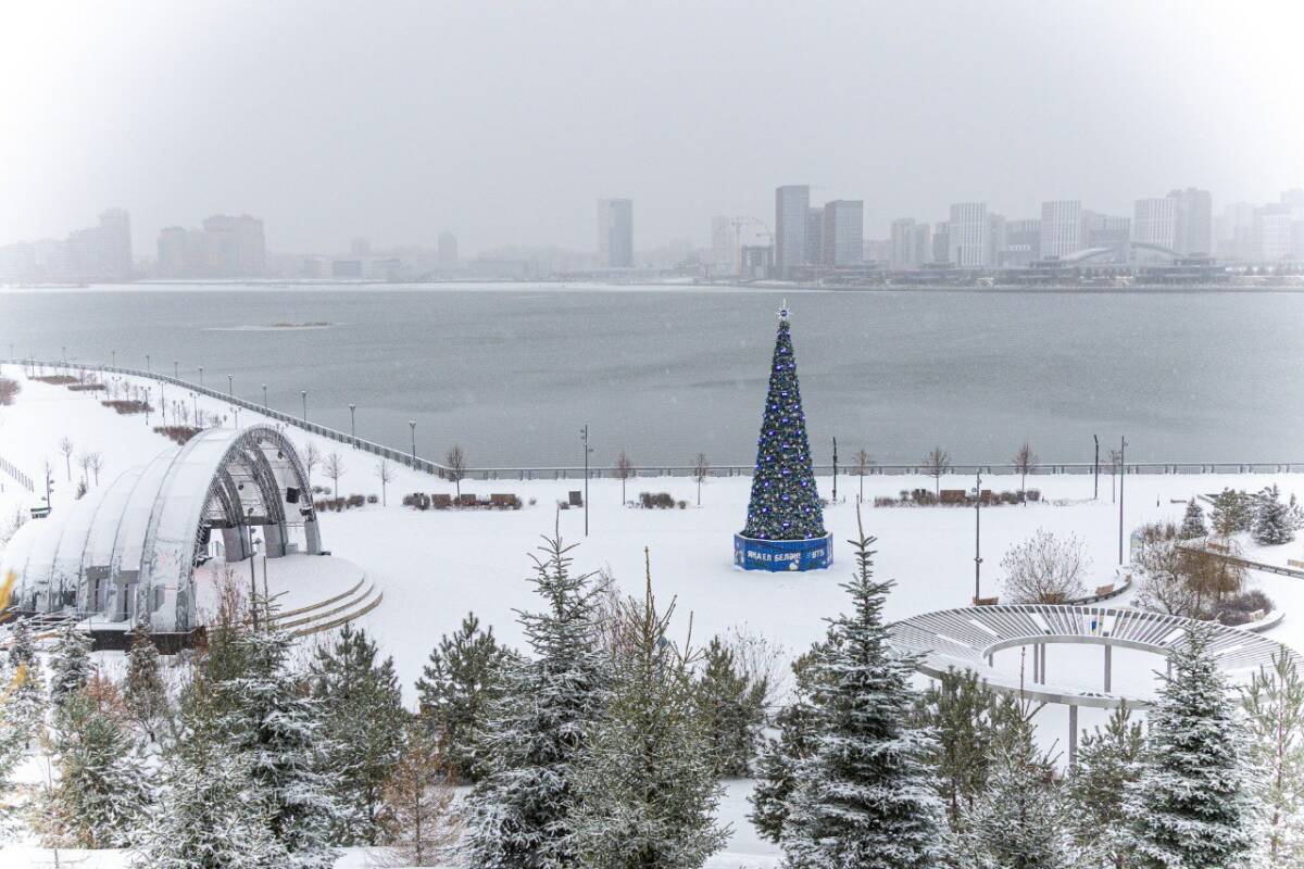 16-метровую новогоднюю ель установили в детском парке «Елмай». Ее украшают 1300 шаров и 700-метровая гирлянда. Подиум, на котором размещена ель, оформлен в виде вязаного шарфа в стилистике праздничной кампании ВТБ «Новогодничайте».