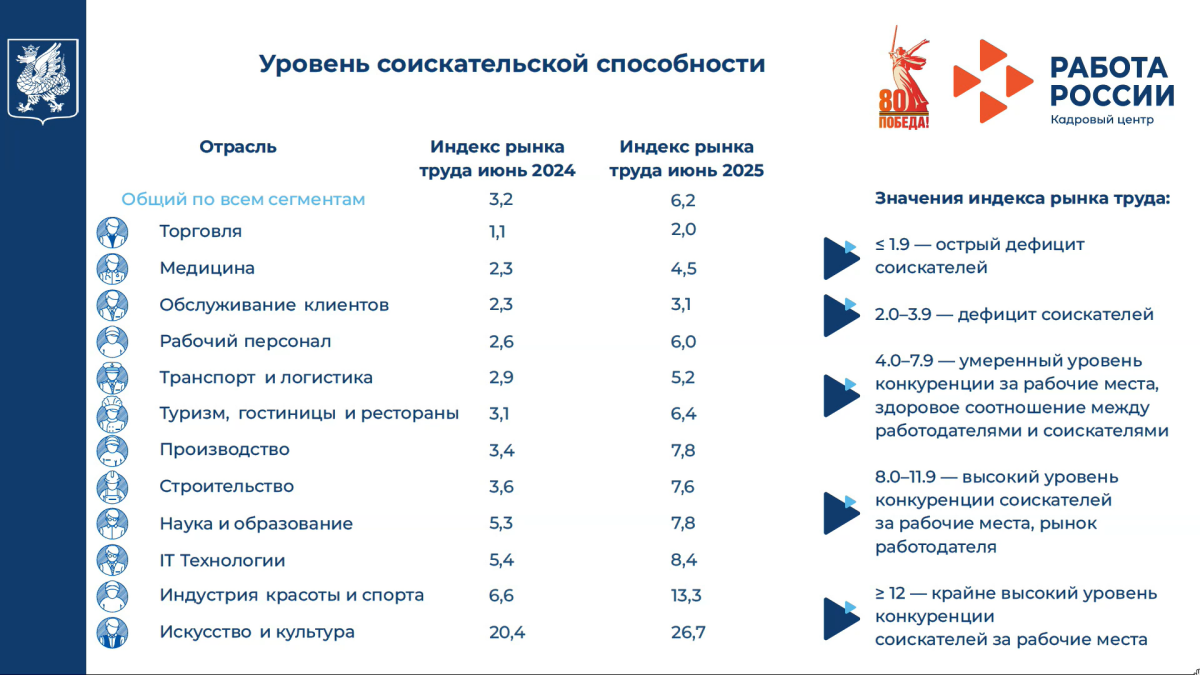 При этом на фоне снижения количества предложений резюме соискателей стало заметно больше – их число выросло на 30%. Индекс рынка труда (соотношение количества активных резюме к числу вакансий) увеличился на три пункта. Если в 2024 году на одну вакансию приходилось в среднем 3,2 резюме, то в 2025 году – уже 6,2. Больше всего индекс вырос в сферах IT, транспорта, строительства, медицины, образования и производства.