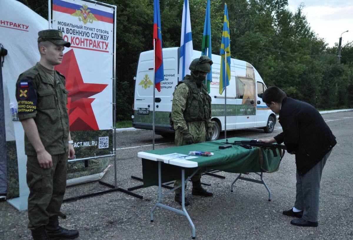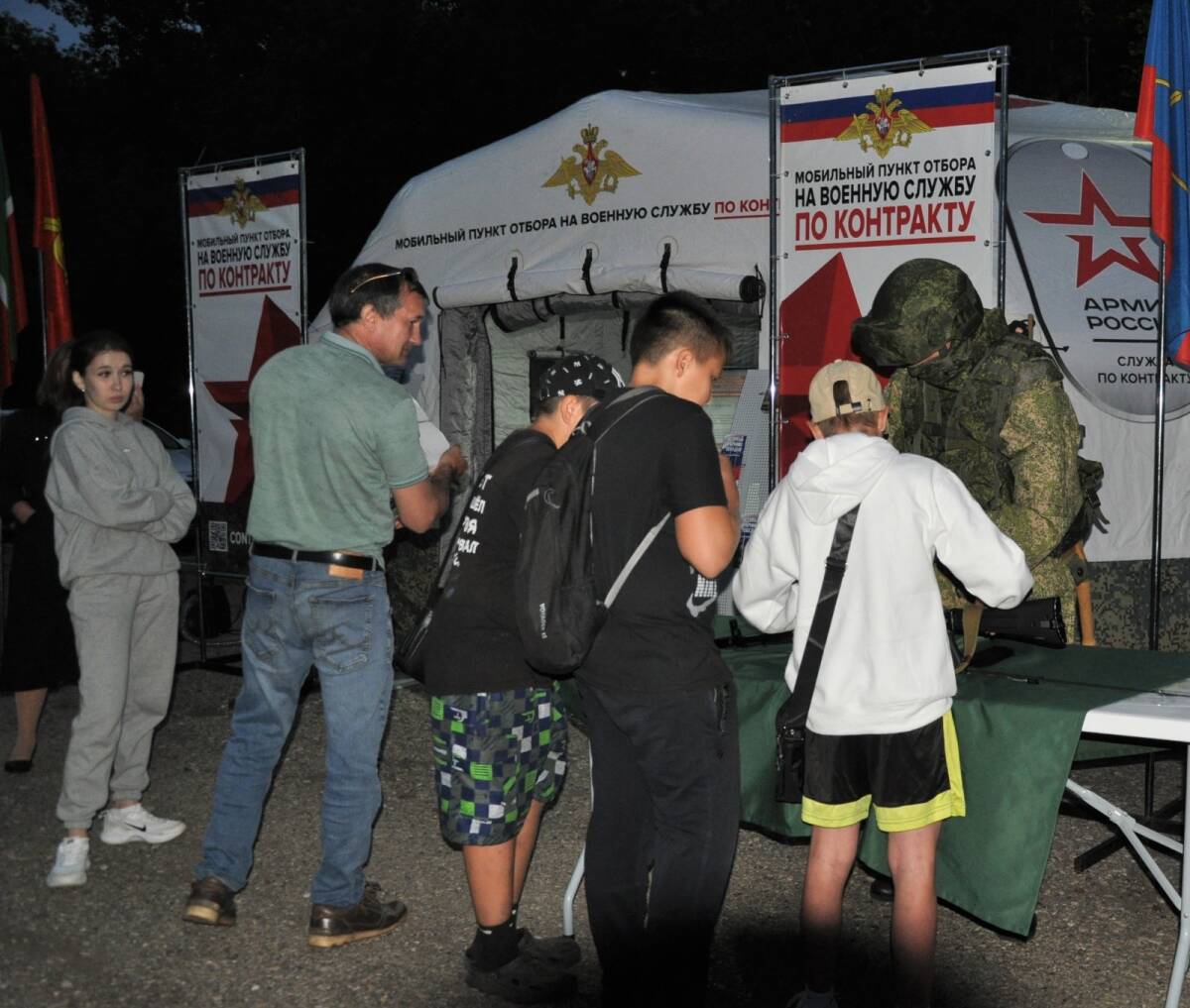 Здесь молодые ребята разъясняли, какие положены единовременные выплаты и какой гарантируется набор льгот от государства гражданам, заключившим контракт с Министерством обороны. Желающие могли разобрать и собрать автомат Калашникова.