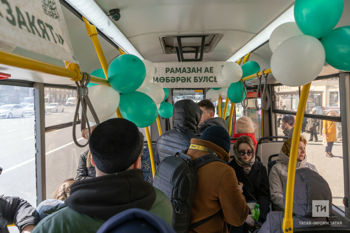 Бесплатный автобус можно отличить по плакату на лобовом стекле «Рамазан мөбарәк булсын». Салон автобуса оформлен воздушными шарами.
