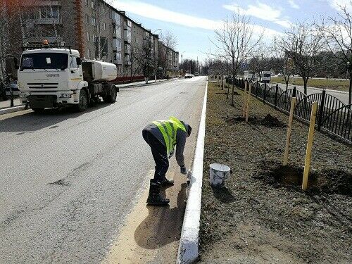 Они убирают мусор, накопившуюся за зиму грязь возле тротуаров, красят бордюры и стволы деревьев.