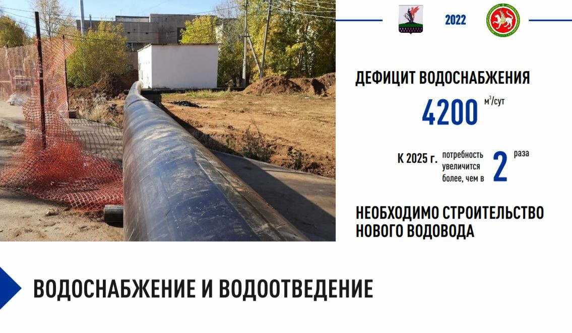 Помимо этой проблемы, очень остро стоит вопрос с водоснабжением нижней части Елабуги, особенно в летний период. Нуриев озвучил, что дефицит в хозяйственно-питьевом водоснабжении составляет 4,2 тыс. кубометров в сутки. С учетом развития города к 2025 году потребность увеличится более чем в два раза, что приведет к невозможности ввода новых жилых микрорайонов.