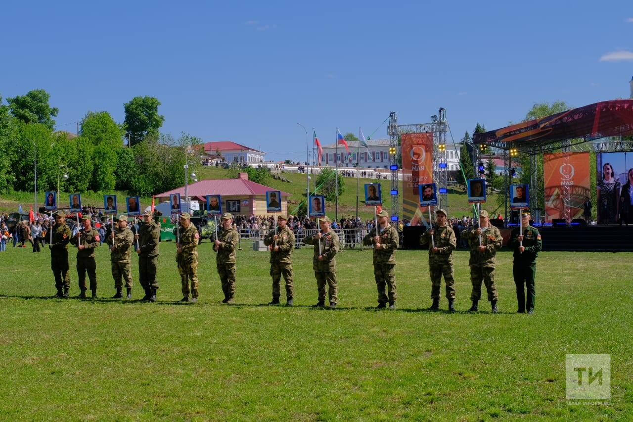 Сегодня на празднике участники спецоперации, находящиеся в кратковременном отпуске, несли портреты погибших боевых товарищей, отдавая дань их памяти. Они вынесли портреты 12 погибших военнослужащих.