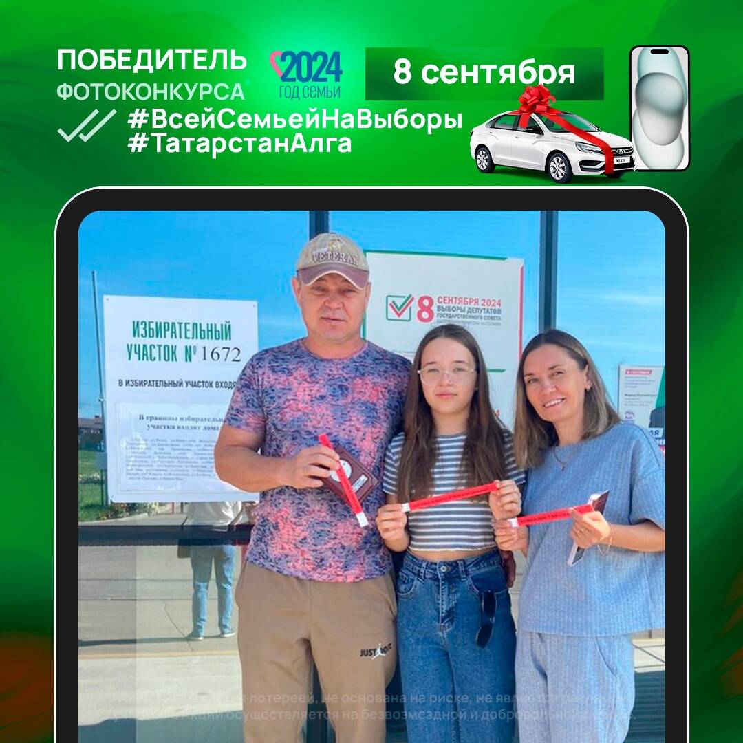 Напомним для того, чтобы стать участником, нужно сделать фотографию со своей семьей на фоне избирательного участка (именно снаружи, а не внутри здания) в специальном браслете, который могут получить проголосовавшие в Республике Татарстан. На снимке должен присутствовать узнаваемый элемент входной группы избирательного участка: надпись, плакат или баннер. Браслет должен быть виден на фото как минимум у одного человека, достигшего 18-летнего возраста.