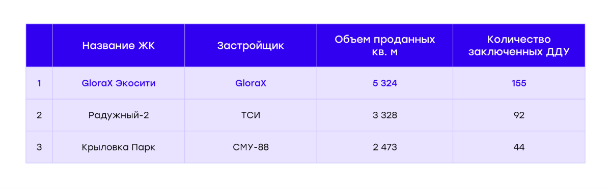 Кроме того, проект GloraX Экосити стал лидером по объему продаж в окружении за октябрь–декабрь 2024 года, обеспечив 30% проданных квадратных метров от общего объема реализованных квартир в локации. Суммарная площадь проданного жилья в проекте составила 5 324 кв. м. В ТОП-3 жилых комплексов по объему продаж за последние три месяца также вошли «Радужный-2» и «Крыловка парк». Для сравнения, в этих двух проектах за тот же период удалось продать лишь 3 328 кв. м и 2 473 кв. м соответственно.