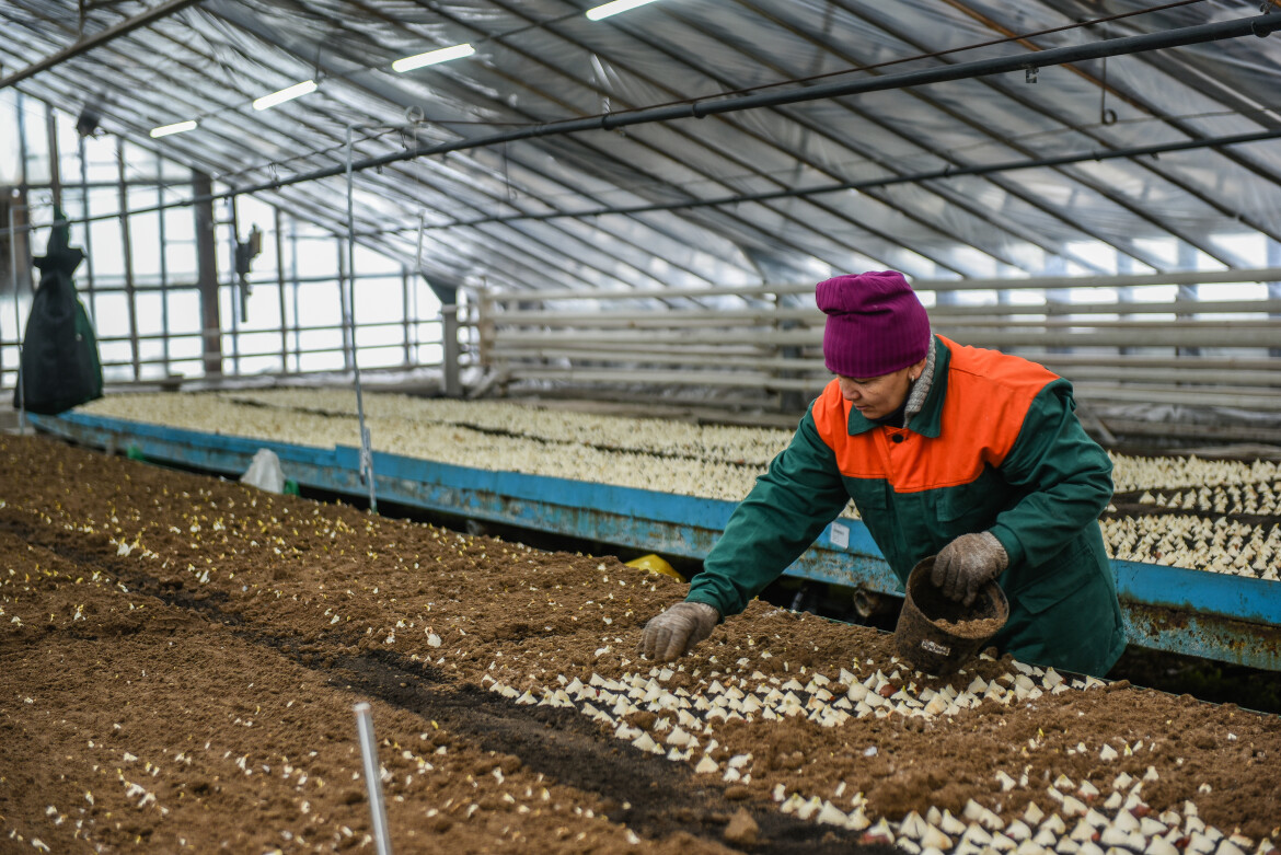 Гульфира Хафизова работает здесь 43 года и имеет 25-летний стаж выращивания тюльпанов. Она рассказала, что больше 20 лет назад луковицы сажали в ящики и уже в октябре ставили в холодильник, а в конце января высаживали в теплицу. Женщина отмечает, что любит свою работу всей душой и занимается цветами дома и на садовом участке.