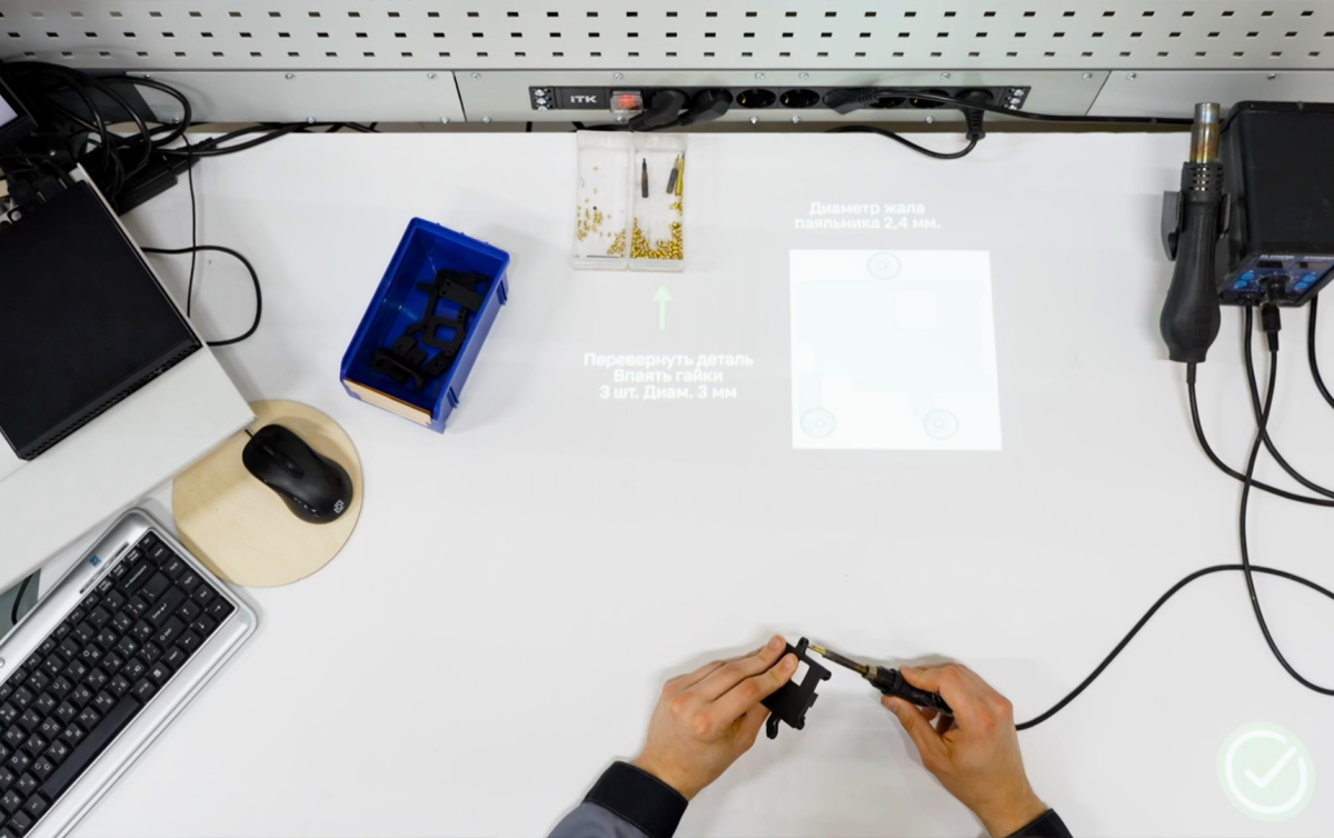 Цифровой помощик включает специальную камеру, которая устанавливается над рабочим местом сборщика беспилотников, и компьютерную программу. Авторизовавшись в системе и выбрав деталь, работник помещает ее в зону детекции для распознавания системой. Та делает это при помощи компьютерного зрения и автоматически запускает цифровую и голосовую инструкции. На рабочем столе оператора пошагово высвечиваются необходимые подсказки. Если он совершает ошибку, запускается звуковой сигнал.