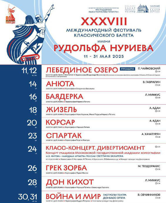 Неожиданные пункты программы – класс-концерт студентов Московской академии хореографии (24 мая), которую в статусе и.о. ректора не так давно возглавила прима-балерина Большого театра, народная артистка России Светлана Захарова. А также балет «Война и мир» – последнее творение худрука «Кремлевского балета» Андрея Петрова, скончавшегося в 2023-м, – которым артисты «Донбасс Оперы» закроют Нуриев-фест (таким образом, финальных гала-концертов в этом году не будет).