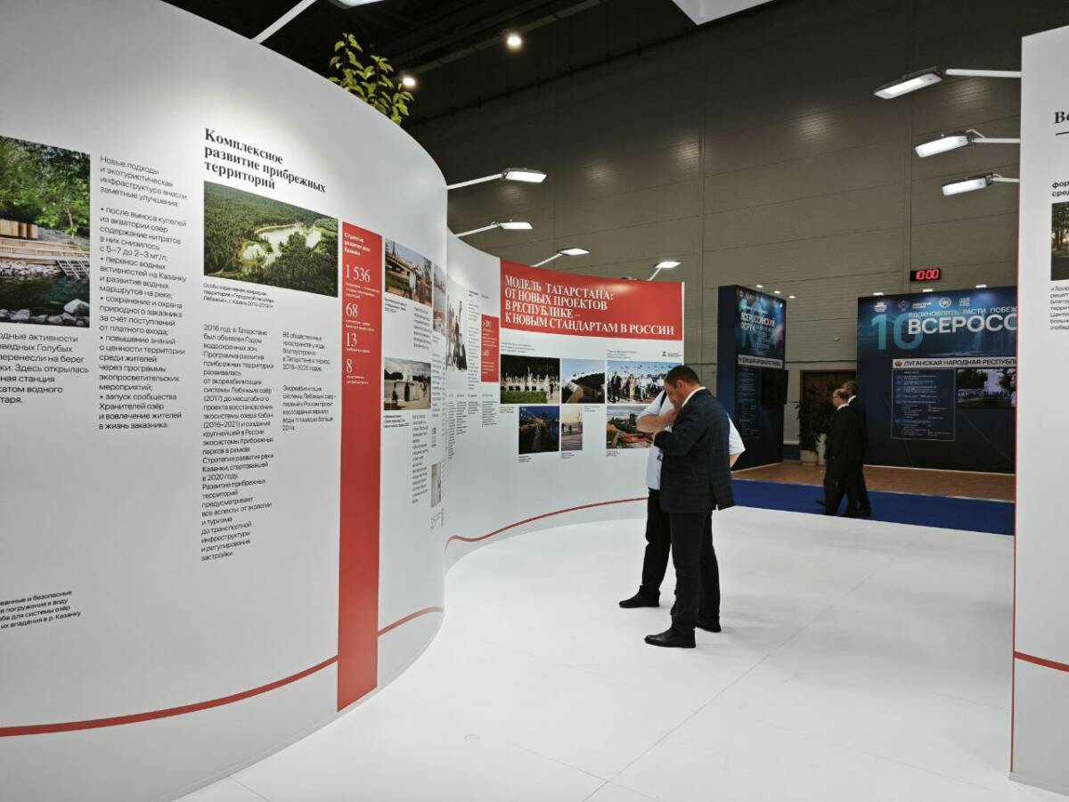 Стенд Института развития городов Татарстана демонстрирует результаты программы «Наш двор», инициированной Раисом РТ Рустамом Миннихановым. За шесть лет проведено 10,8 тыс. собраний с жителями, благоустроено 5,8 тыс. дворов, обновленная среда появилась у 1,6 млн человек. В программу вложено 54 млрд рублей.