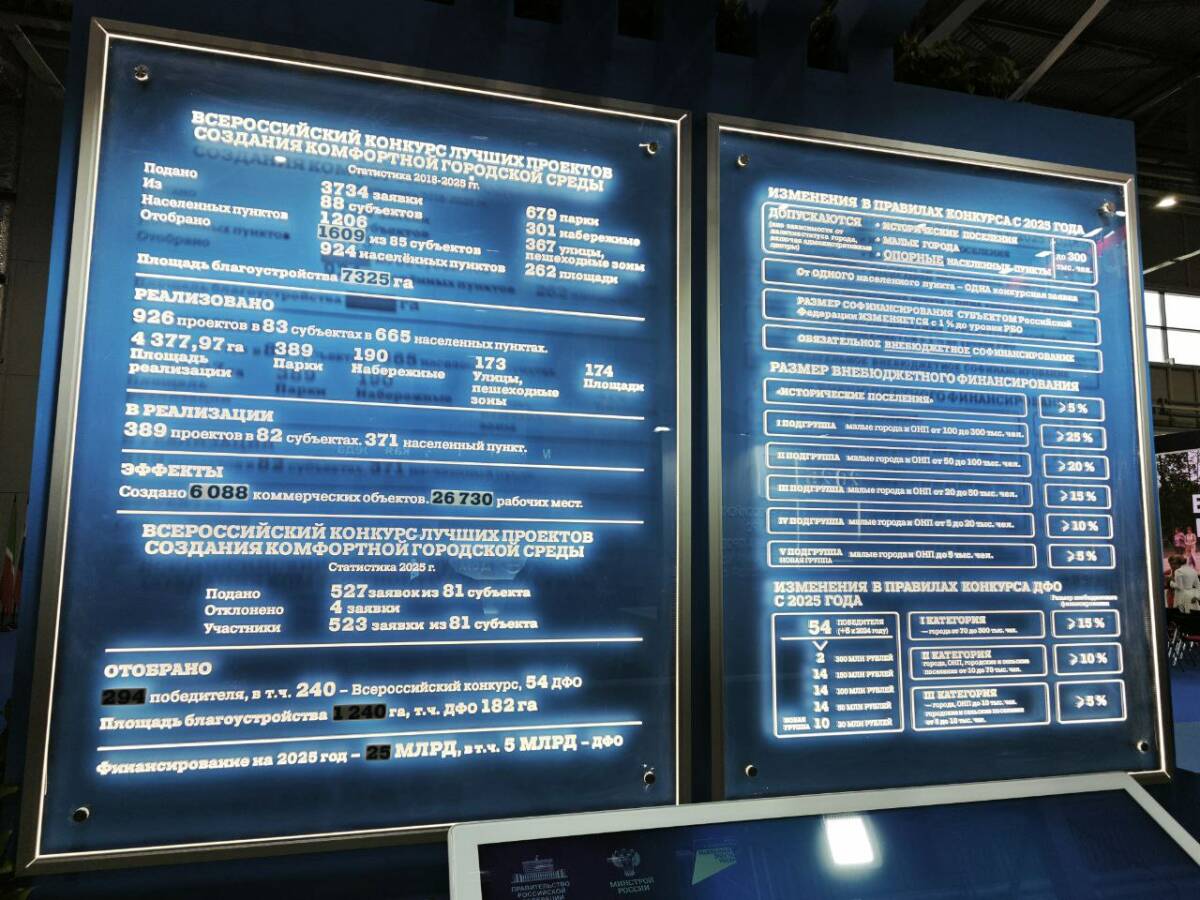 Отдельный стенд Министерства строительства и ЖКХ РФ посвящен всероссийскому конкурсу лучших проектов создания комфортной городской среды. С 2018 года на конкурс поступило 3,7 тыс. заявок из 88 регионов, отобрано 1,6 тыс. проектов. Среди них – 945 парков, 301 набережная, 367 улиц и пешеходных зон, 262 площади. Уже реализовано 926 инициатив, в работе остаются еще 389. В 2025 году на конкурс подали 527 заявок, из которых 294 победителя получат федеральное финансирование в общем размере 25 млрд рублей.