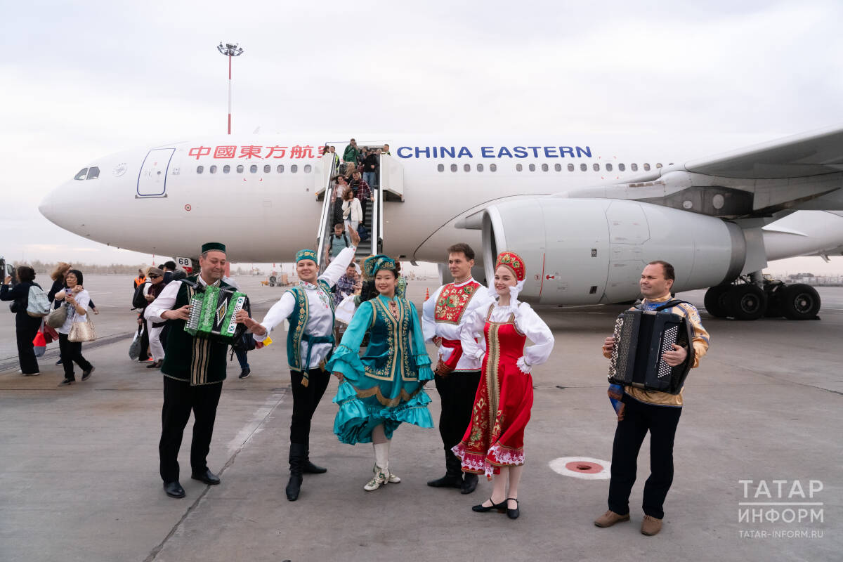 В Казань прилетел первый авиарейс из китайского города Шанхая. Самолет приземлился в аэропорту столицы Татарстана и проехал через водную арку. Пассажиров встретили национальными татарскими угощениями и танцами.