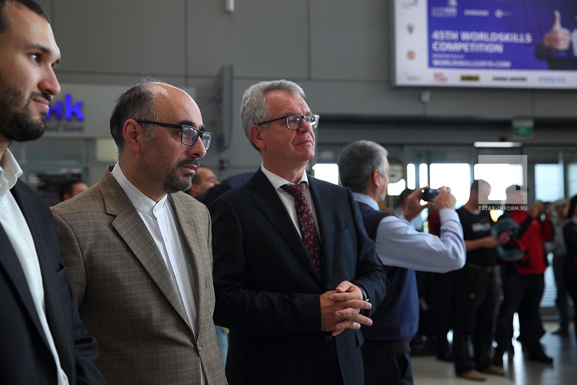 Уже с 7 утра в аэропорту репетировал встречу с иранскими делегатами Государственный фольклорный ансамбль РТ, волонтеры WorldSkills, консул Ирана в Казани Малекоддин Шафагат, первый заместитель министра образования Татарстана Андрей Поминов.